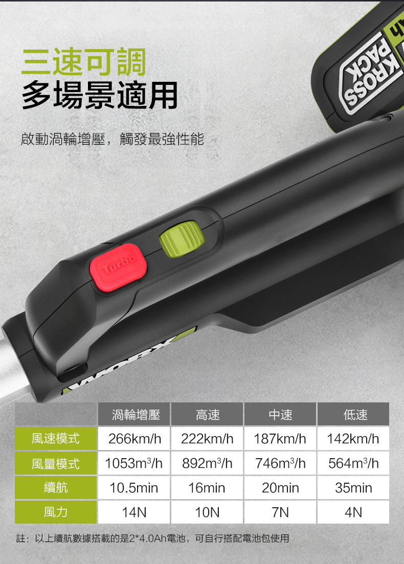 續航力:低速: 35mins/ 中速: 20mins/ 高速: 16mins/ 渦輪增壓: 10.5mins(配備4.0電x2)