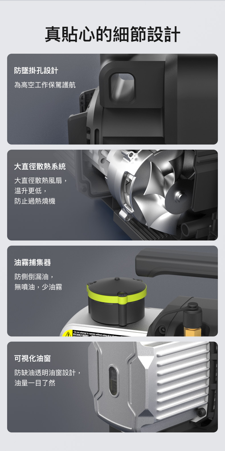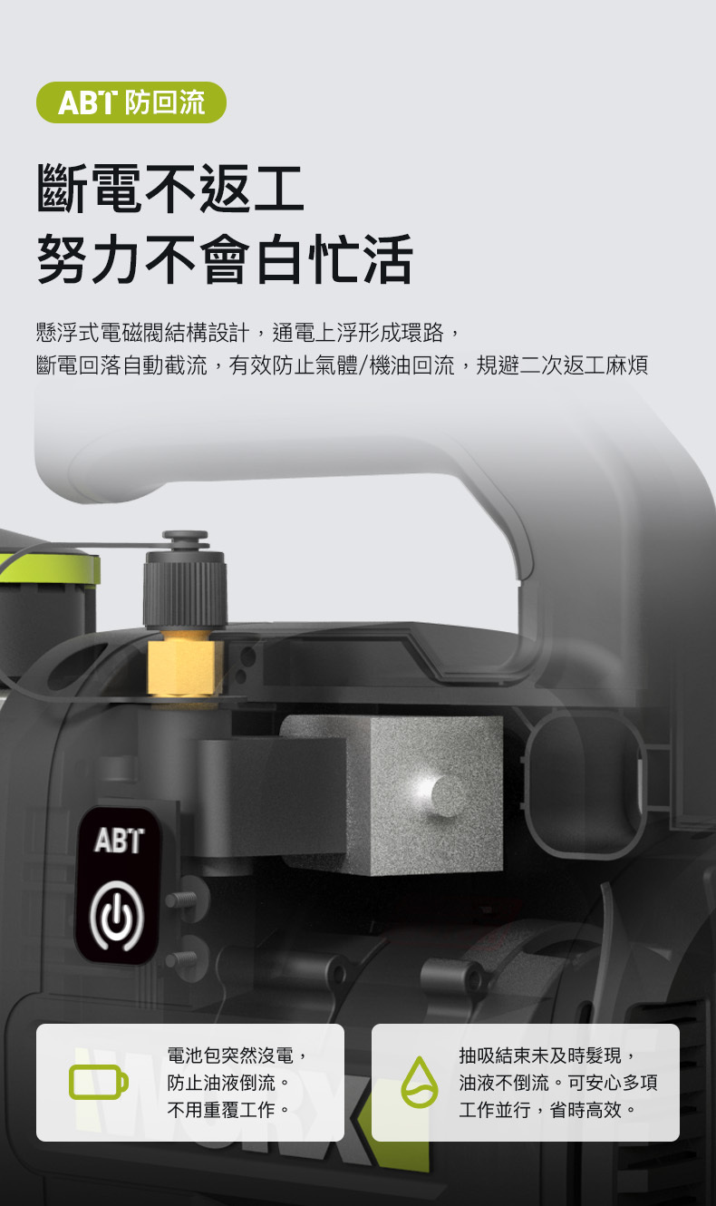 -斷電自動截流,防止氣體/ 機油回流