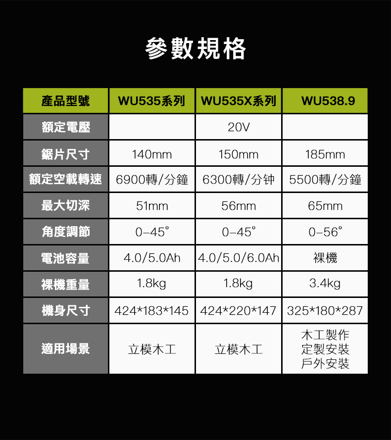 WU538H.9 20V 185mm 無刷電圓鋸 (淨機)