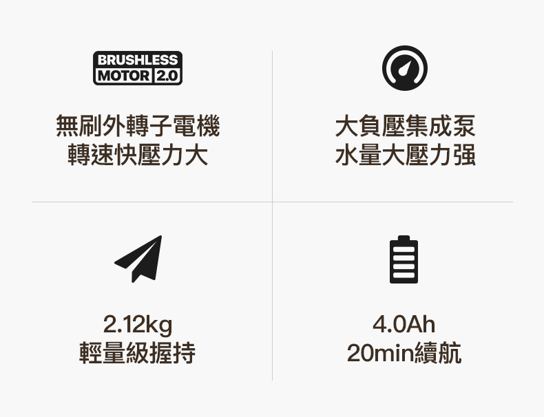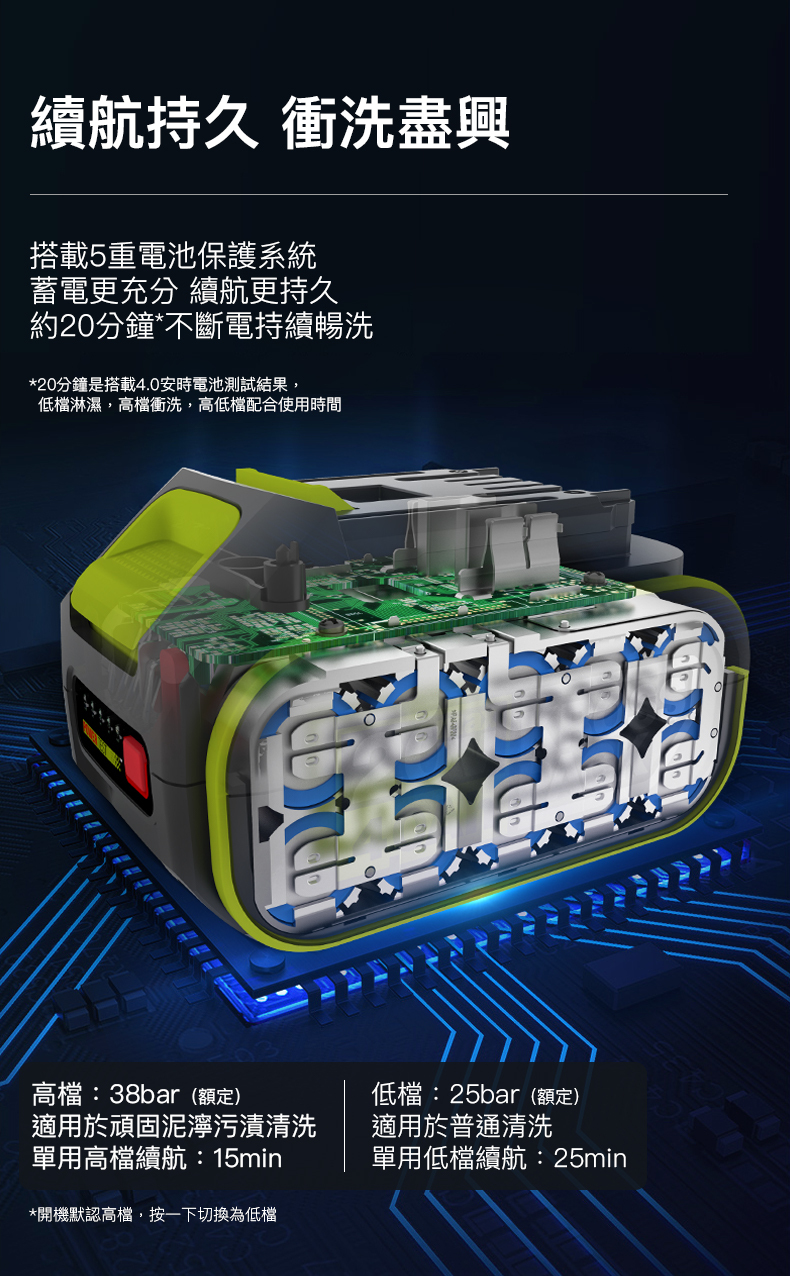 產品性能: 高檔速: 38bar, 續航: 15分鐘